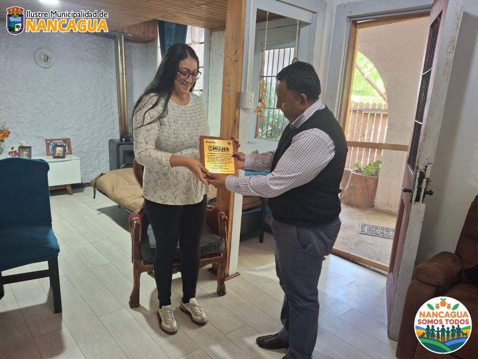 En el marco de la conmemoraci贸n del Mes de la Mujer, se realiz贸 una visita a la vecina destacada Nicol Huerta Adasme, instancia en la que el Alcalde, Gabriel Ahumada D铆az, junto a la Directora de Desarrollo Comunitario y funcionarios municipales, hicieron entrega de un galvano en reconocimiento a su valioso ejemplo de vida.